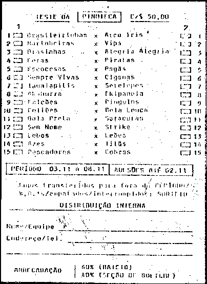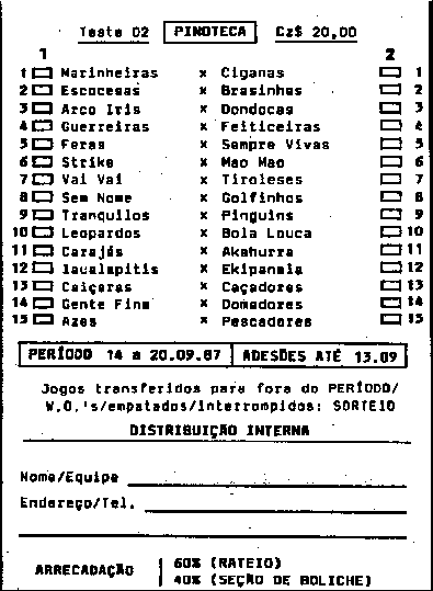 A pinoteca durou apenas quatro testes, sendo infelizmente encerrada ao final da primeira fase daquele Campeonatão. Foram apenas quatro volantes, mas é curioso notar a quantidade de equipes (como Marinheiras, Tranquilos, Caras de Anjo e Caiçaras, entre outros) que figuravam no boliche daquela época e que hoje não existem mais.
